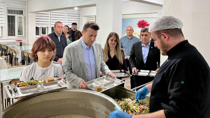 Pansiyon yemekhanesinde sıraya girerek yemeğini alan Kaymakam Cıdıroğlu, öğrencilerin akşam yemeğine eşlik etti. İlçe Milli Eğitim Müdürü Dr. Mehmet Gök ve okul müdürü Tuğrul Boztepe’nin de hazır bulunduğu ziyaret samimi bir ortamda gerçekleşti.